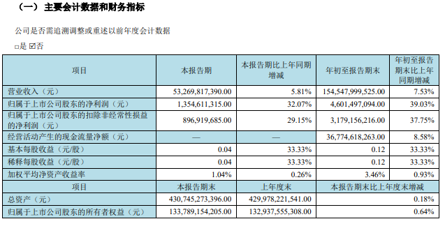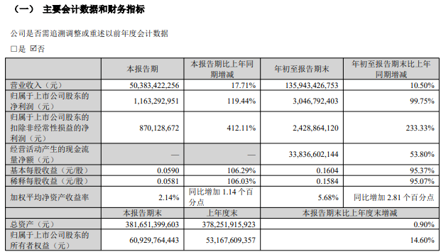 In terms of cash flow and asset status, the net cash flow from operating activities from the beginning of the year to the end of the period reached 6.462 billion yuan, a YoY increase of 43.58%, with cash flow adequacy improving significantly, mainly due to the YoY improvement in profits and the optimization of business collection.