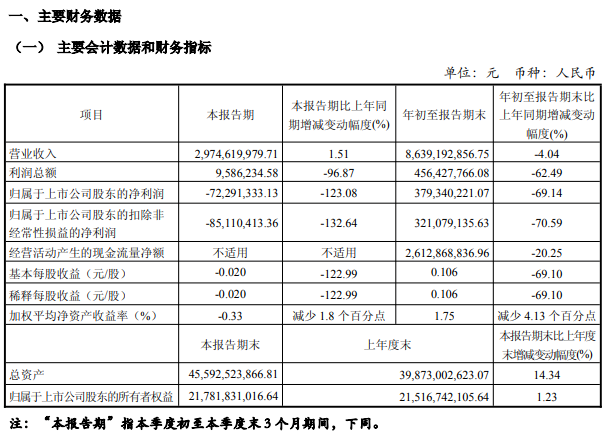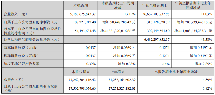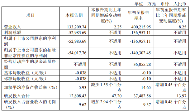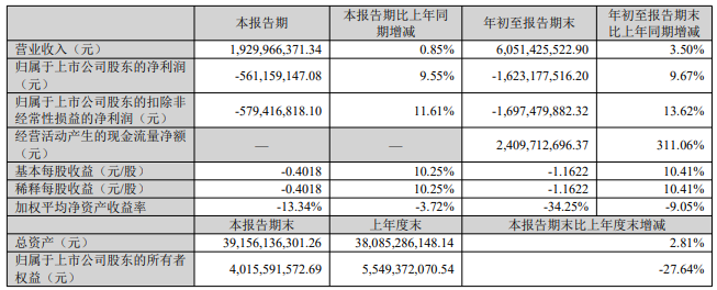 Among them, in Q3, operating revenue was 1.332 billion yuan, a YoY increase of 2.25%; net profit attributable to shareholders of listed companies was -530 million yuan; net profit attributable to shareholders of listed companies after deducting non-recurring gains and losses was -540 million yuan.