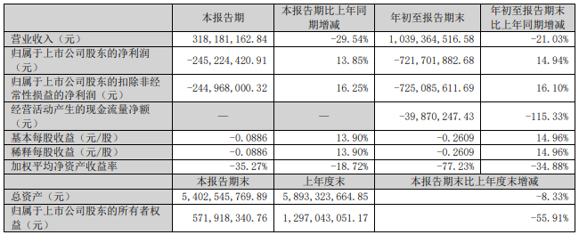 In the first three quarters, operating revenue was 1.039 billion yuan, a YoY decrease of 21.03%; net loss attributable to shareholders of listed companies was 722 million yuan; basic EPS was -0.2609 yuan.