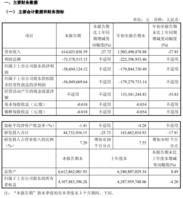Q3 revenue was 614 million yuan, a YoY decrease of 27.72%; net loss was 58.6941 million yuan.