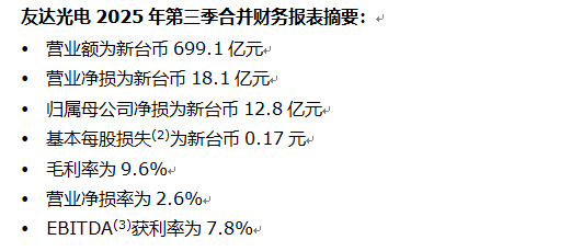 On October 30, AU Optronics held an investor conference to announce its consolidated financial statements for Q3 2025. The total consolidated turnover in Q3 2025 was NT$69.91 billion, an increase of 1.0% compared with Q2 2025 and a decrease of 10.1% compared with Q3 2024. The net loss attributable to owners of the parent company in Q3 2025 was NT$1.28 billion, with a basic loss per share of NT$0.17.